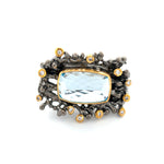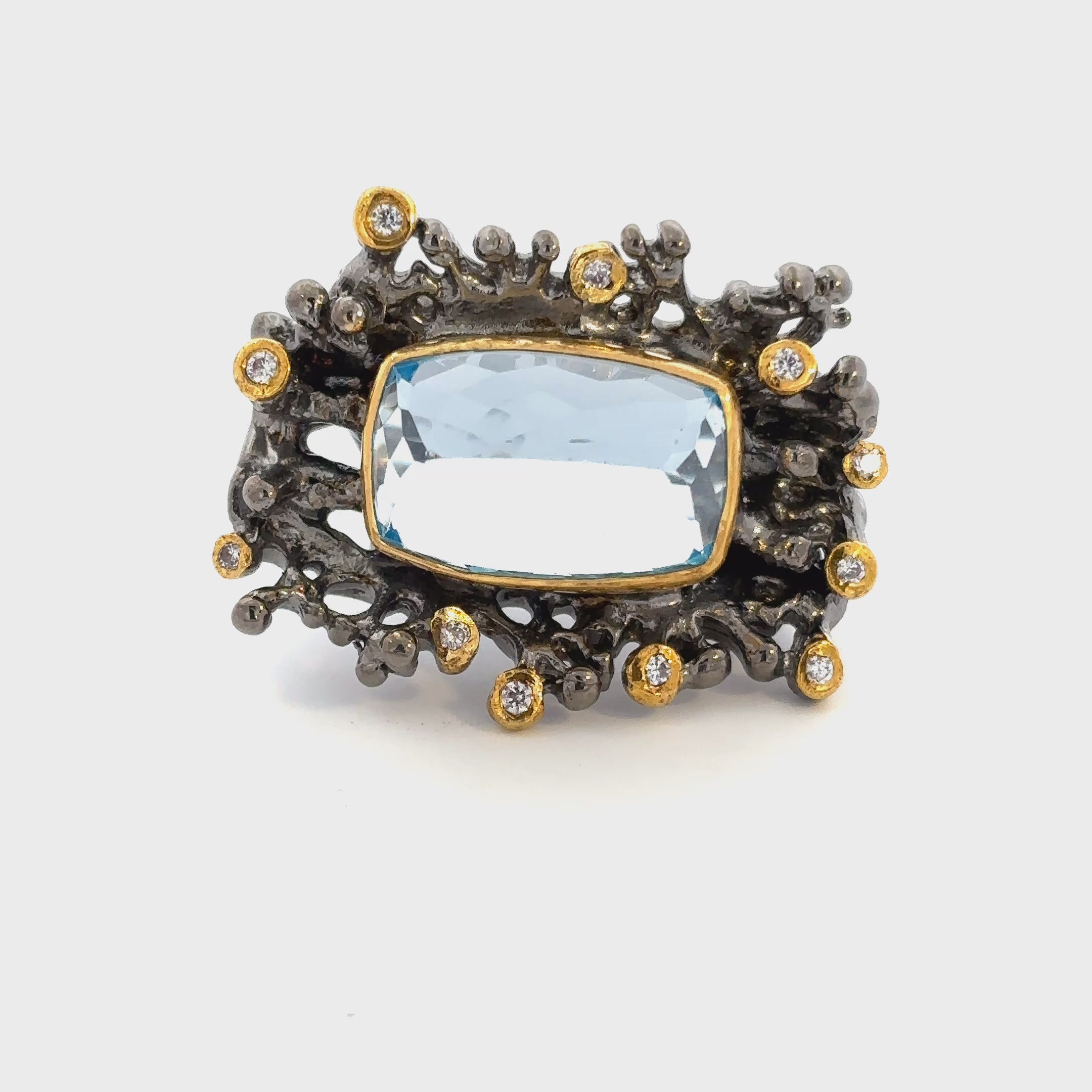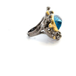 A true statement of artistry and light — this bold cocktail ring features a striking high-clarity blue topaz, hand-set in oxidized sterling silver and framed with delicate 24K gold details. Its sculptural design evokes oceanic forms, where depth and brilliance coexist in harmony.