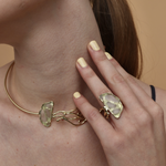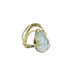 Organic and fluid, the Elira Ring is inspired by the soft, floating movement of a jellyfish. A freeform light green stone is framed by sculptural brass lines, creating a piece that feels alive with motion and light.