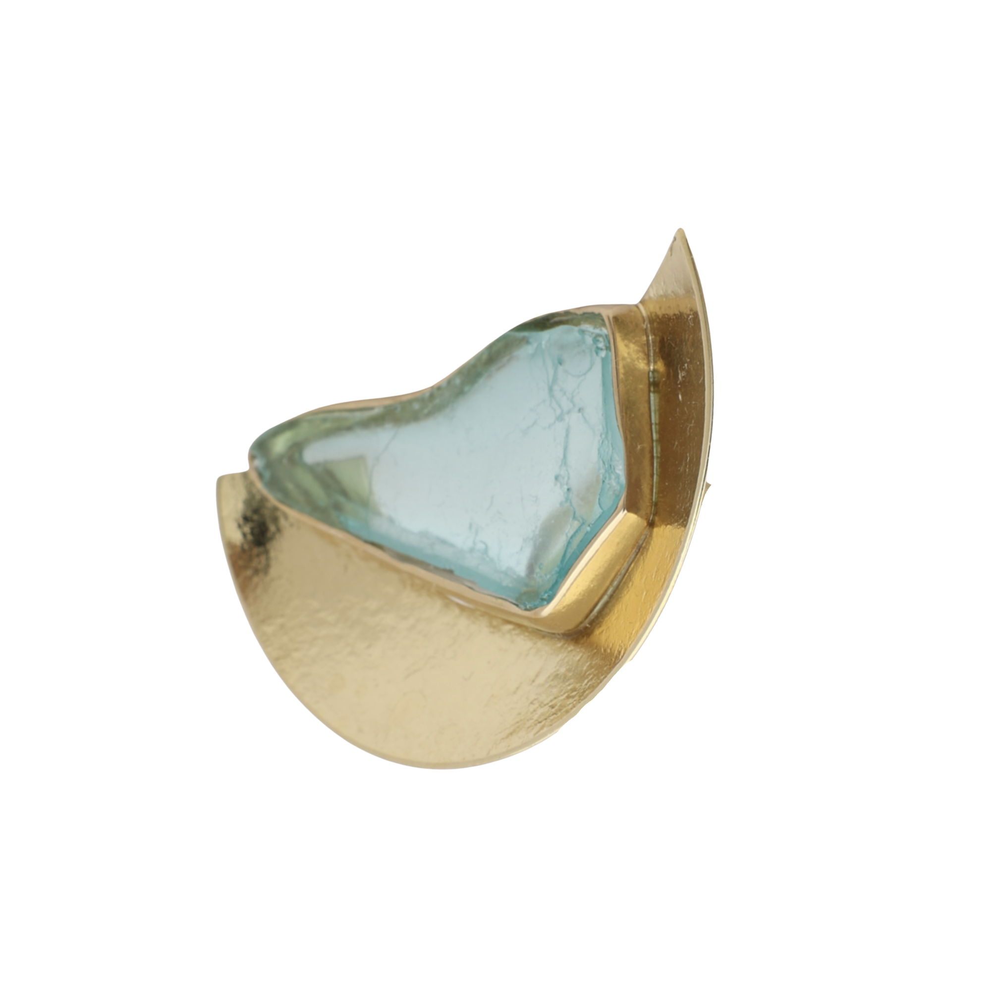 A bold sculptural ring inspired by the calm geometry of coastal lagoons. A luminous aqua-toned stone rests within a sweeping brass arc, creating a striking balance between organic texture and modern form.