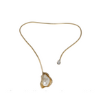 The Lucine Choker is not a necklace — it’s a living form. Brass arcs the neck like a tide in motion, opening to reveal a baroque pearl cupped in its shell. A crystal glimmers beside it, sharp and unexpected, like sunlight cutting across water.