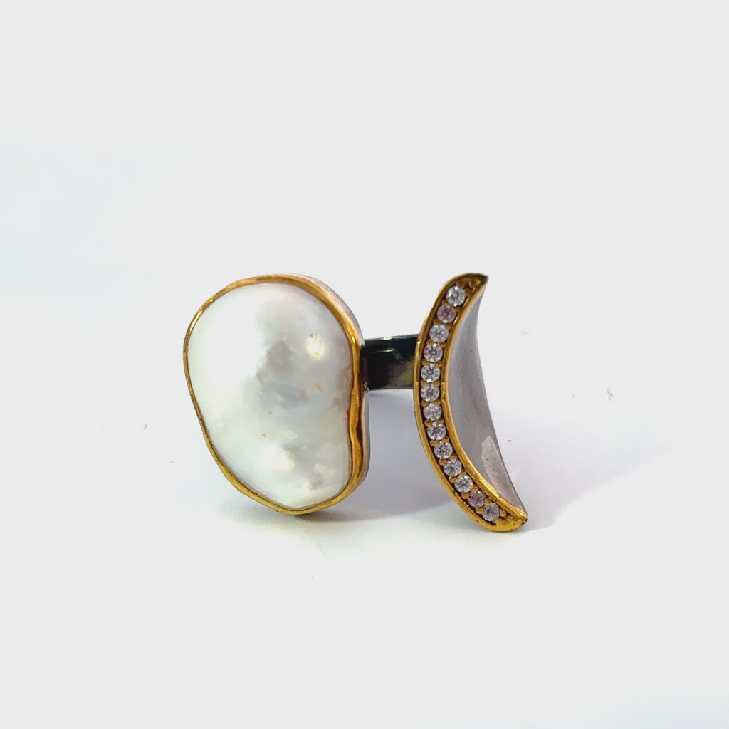 18K gold-plated sterling silver sculptural ring, showcasing a stunning large baroque pearl—elegant, organic, and timeless.